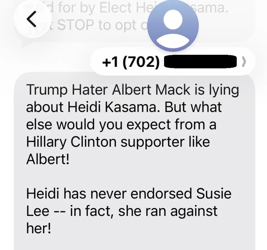 An obviously irked Kasama responded with a spam-text message repeating her debunked claim about Mack being a Hillary supporter.